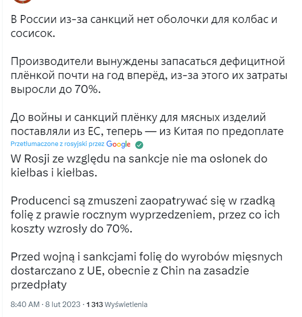 17/Osłabiony rubel to oczywiście wystrzał cen, bo za import trzeba płacić w walucie obcej. Dochodzi już teraz do takich ekstremów, że Chińczycy żądają przedpłat za osłonki do parówek i kiełbas. I choć brzmi to jak żart to spójrzcie.