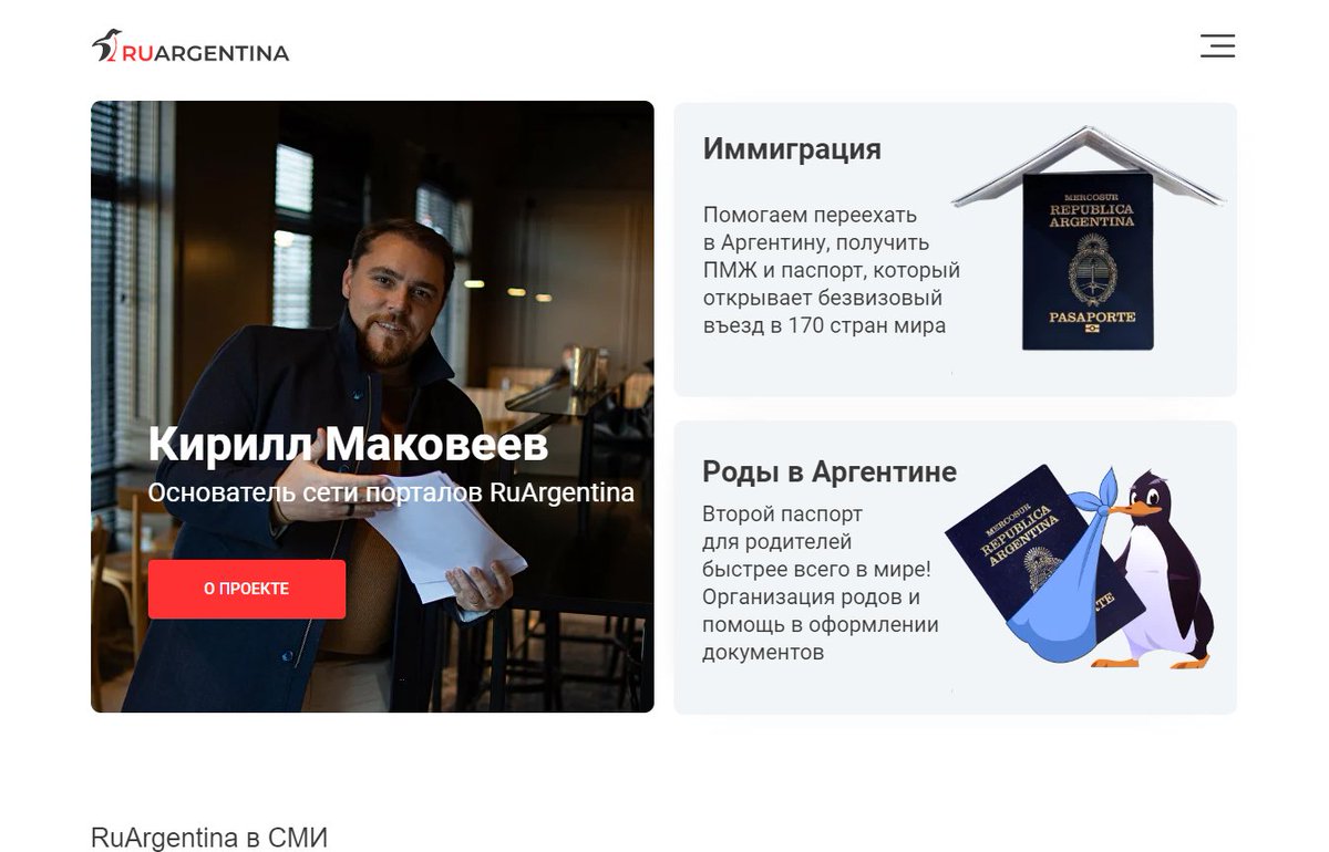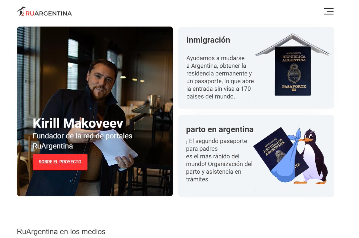 La página tiene como argumento de venta la obtención del pasaporte argentino y la posibilidad de usarlo para entrar a otros países