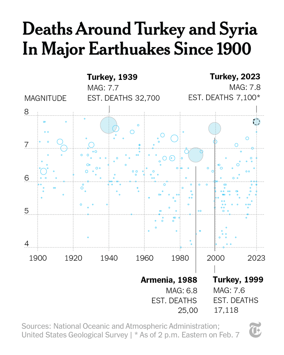 The first quake, a 7.8 magnitude, was one of the strongest in Turkey’s recorded history. It was felt as far away as Lebanon and Israel. nyti.ms/3RIsEW0