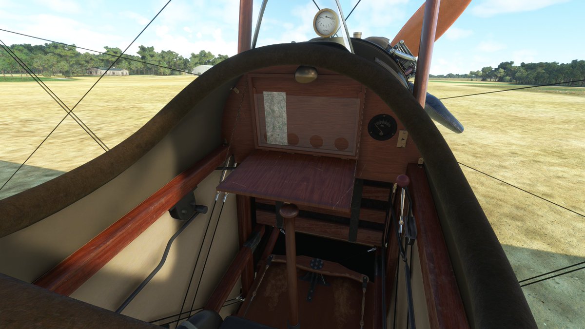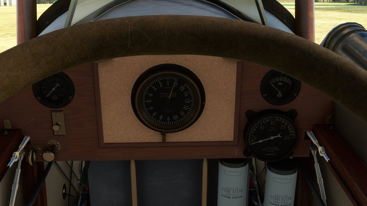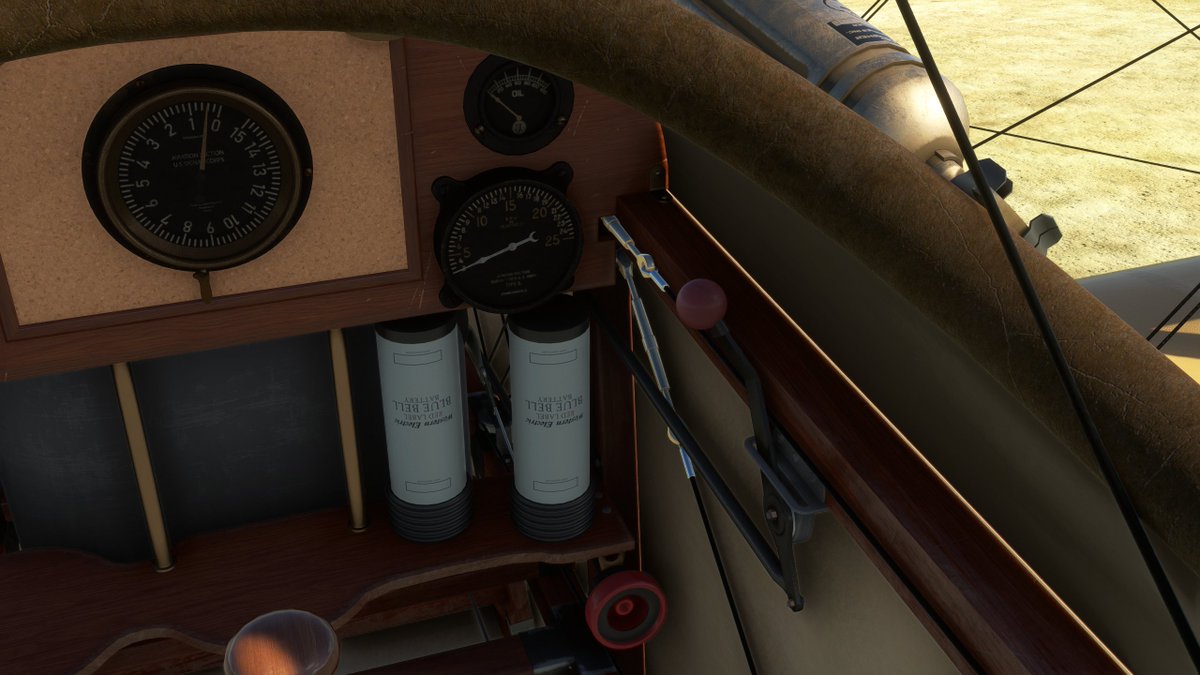 The instrument panel is extremely rudimentary: an altimeter in the center. To the left, engine temperature and fuel cutoff. To the right, an oil gauge and tachometer (for RPM). No airspeed indicator or anything to show the airplane's direction or orientation. No compass either.