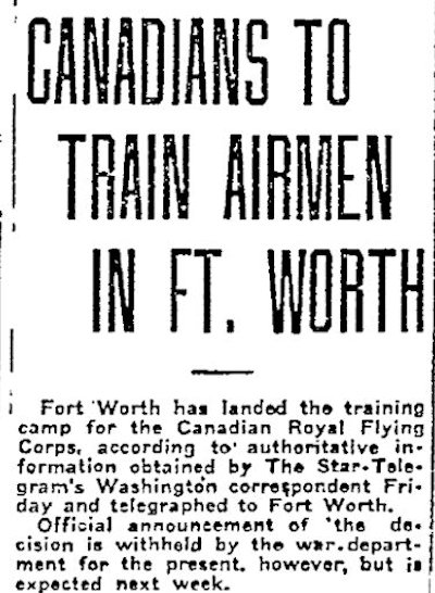 Despite the skis, winter weather in Canada was not conducive to flight training. After the U.S. entered the war in April 1917, it invited the Royal Flying Corps to Fort Worth, Texas for the winter of 1917-8 to perform training there.