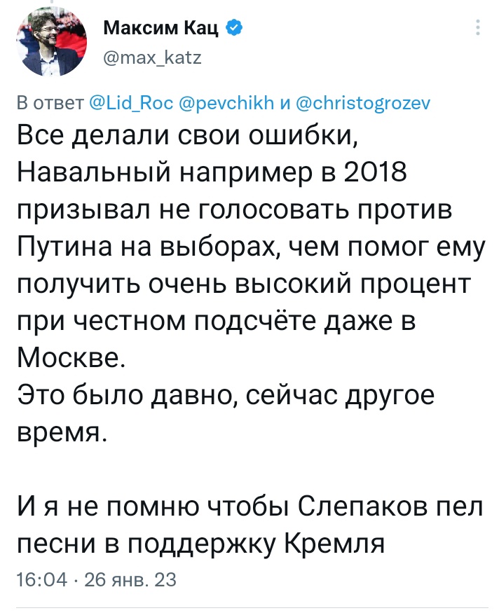 Вернёмся к Собчак. То есть Кац отказался помогать ей, призывал сняться с выборов, а ещё считает, что она зря пошла на выборы и подорвала политическое доверие! Но Навальный виноват в том, что не поддержал её?!