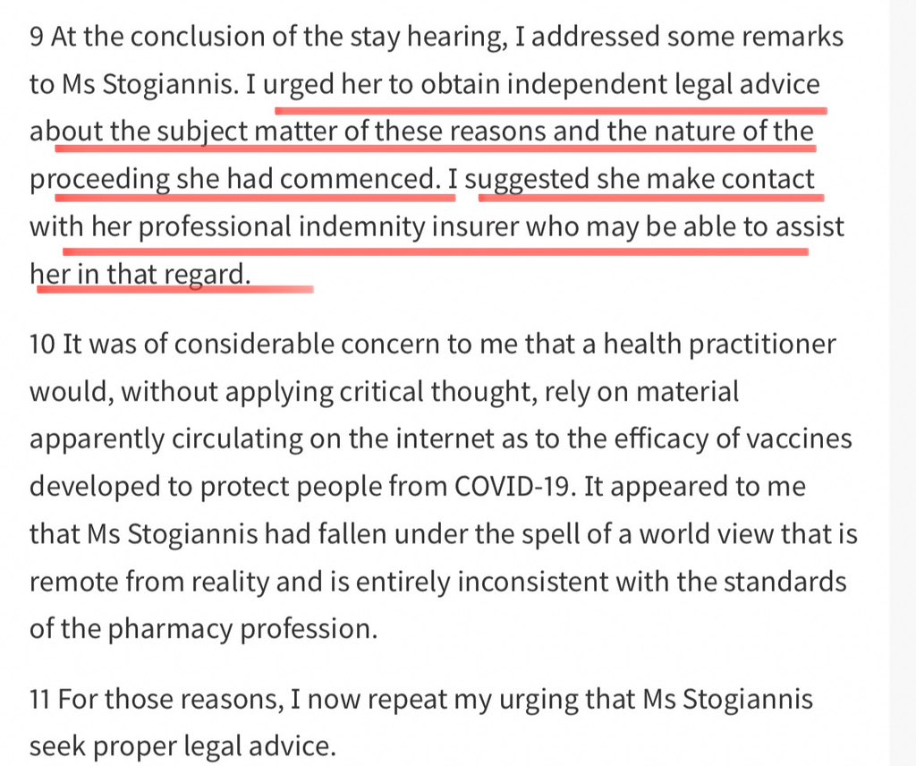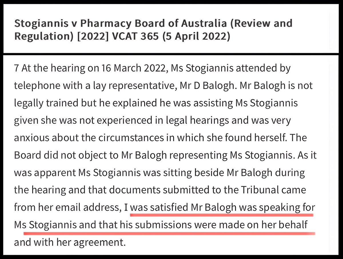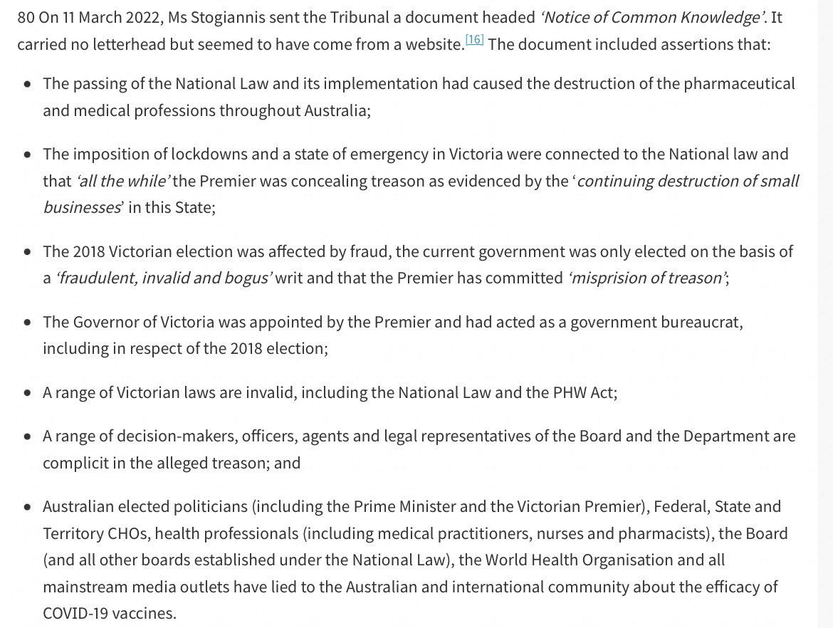 11. Derek also “represented” a suspended pharmacist in VCAT. The gist of Derek’s argument was that the Board couldn’t suspend her registration b/c there were allegations of criminal conspiracy and misprision of treason against Dan Andrews