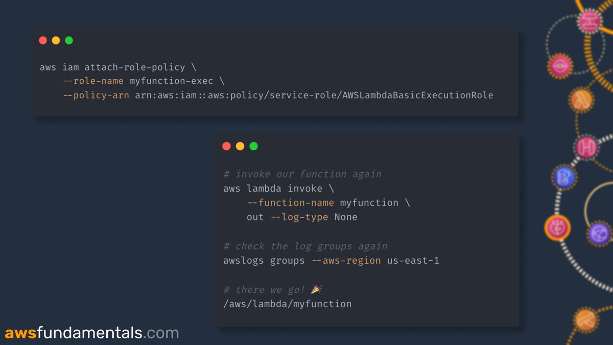 Let's fix this by attaching the AWS-managed AWSLambdaBasicExecutionRole policy