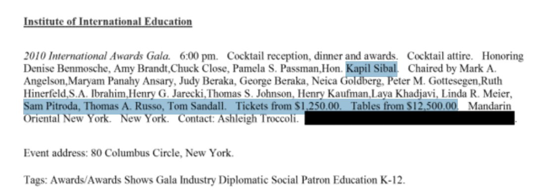 Unsealed Doc EFTA02420041 confirms: In 2010, Kapil Sibal & Sam Pitroda attended a high-society Gala in NYC hosted by the International Institute of Education (IIE).