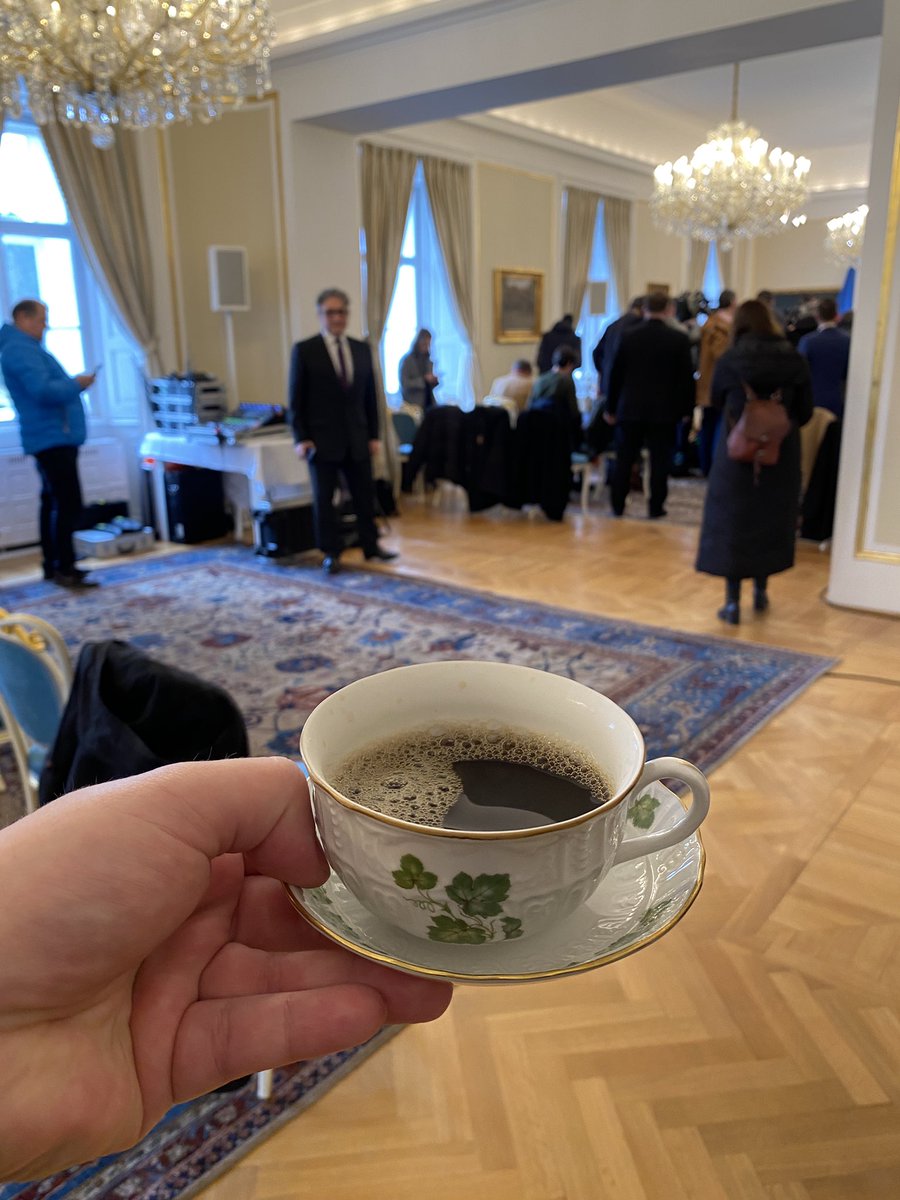 V salónku na nás čeká HORKÁ KÁVA! Novinářští matadoři jsou v šoku a nevěřícně zírají. Nováčci už do sebe tlačí druhý šálek. Máme se tu dobře.