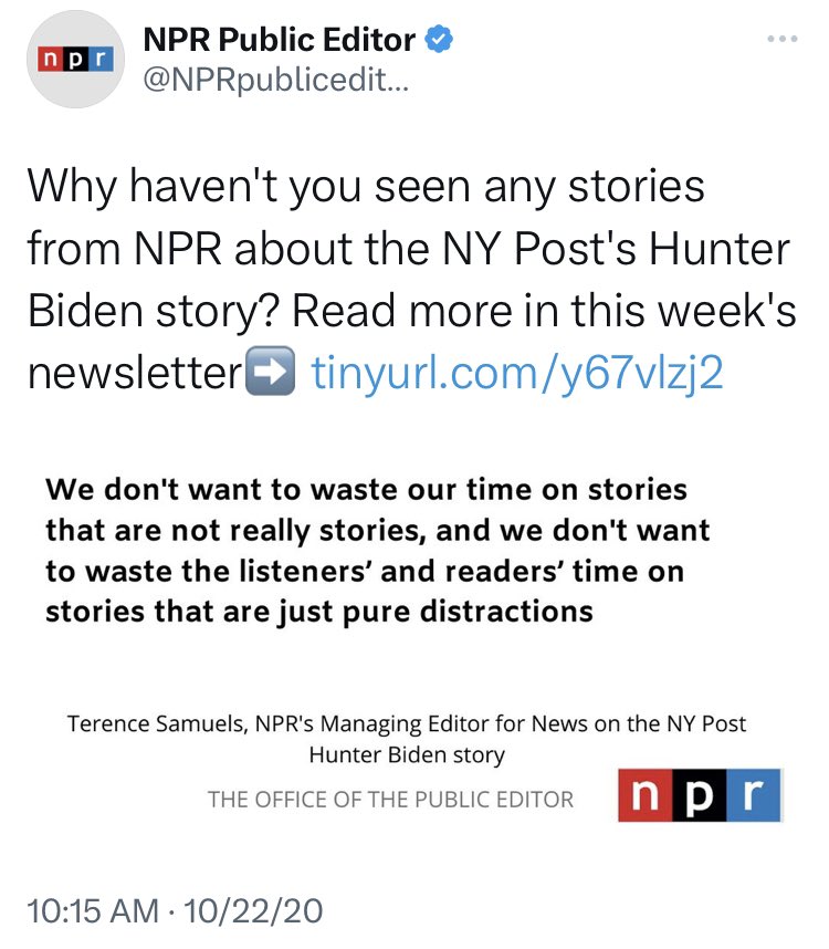 @NPR famously dismissed the @nypost’s story on the Hunter Biden laptop because “we don’t want to waste our time” on “stories that are just pure distractions.”