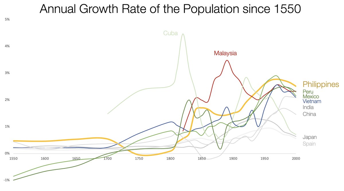 Other Spanish colonies like Mexico, Peru, or Cuba were all growing faster than the Philippines until the 1850s, and the Philippines really started standing out in the 2nd half of the 20th century