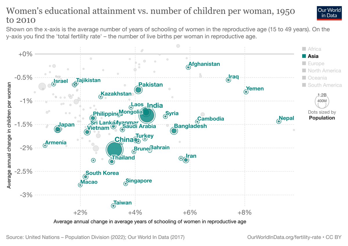 As they study more, their fertility also goes down accordingly (not faster or more slowly than comparable countries)