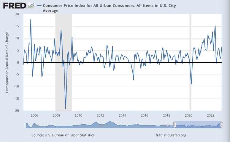 Much has been made of the annualized m/m rate spiking back up to 6.4%. However, you'll notice that the m/m numbers tend to be volatile, and that the recent trend is still noticeably reduced.