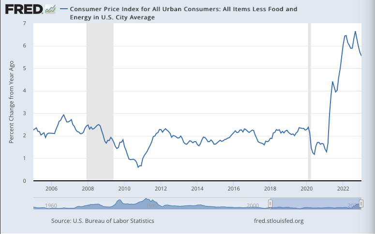 Core CPI (excluding food and energy) rose +0.4% m/m in January, up +5.5% from a year ago. This is down from a peak of +6.6% y/y in September.