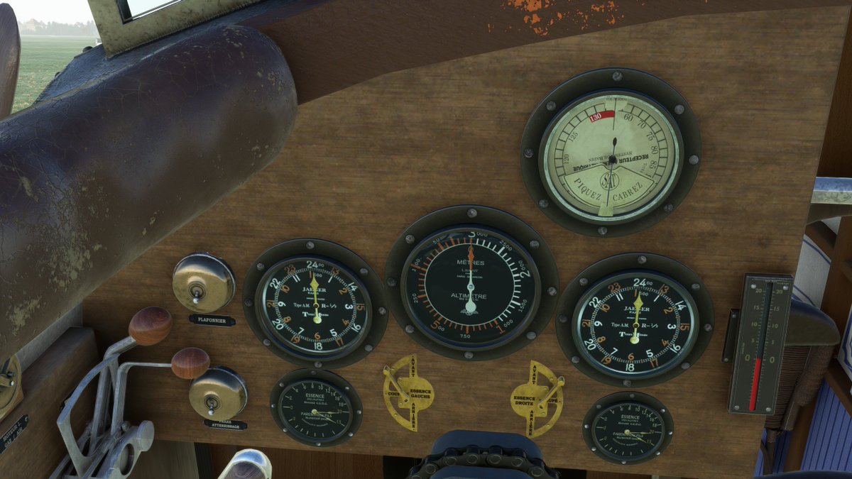 The airspeed indicator bears a closer look. It show km/hour, and highlights the "danger zone" of flying any faster than 130 km/hour (70 knots). The lower needle indicates the aircraft's pitch: "piquez" for nose down, "cabrez" for nose up.
