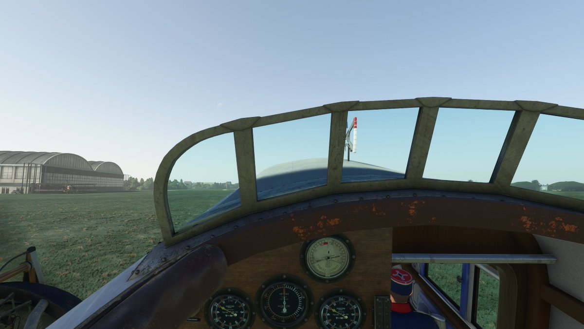 I'm barely able to discern the two crisscrossing runways from the wear marks in the grass. I'm circling the airport until I can figure out which one the wind favors.