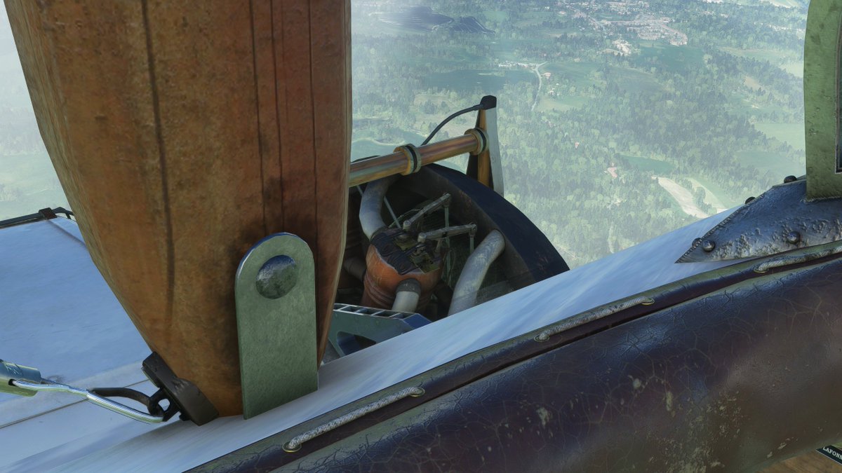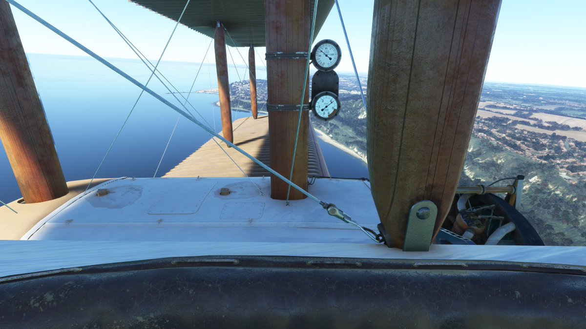 I'm plugging along at about 110 km/hour, or 60 knots, to avoid overheating the engines. I can see them clattering away, from my perch in the cockpit.