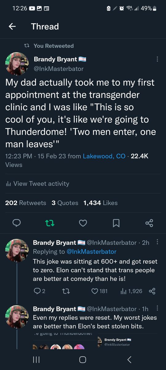 This joke was sitting at 600+ and got reset to zero. Elon can't stand that trans people are better at comedy than he is!