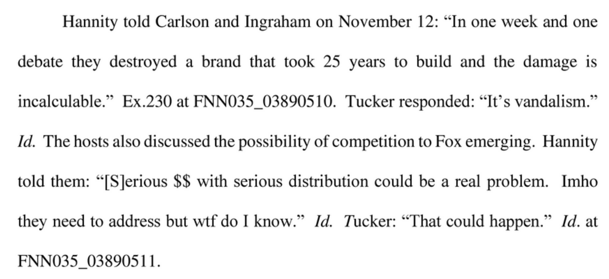 This filing in the Dominion lawsuit against Fox News is one of the most remarkable documents I've ever seen. Filled with private texts between Fox stars like Hannity and Carlson, plus Murdoch, all admitting they knew Fox's stolen election claims were lies. int.nyt.com/data/documentt…