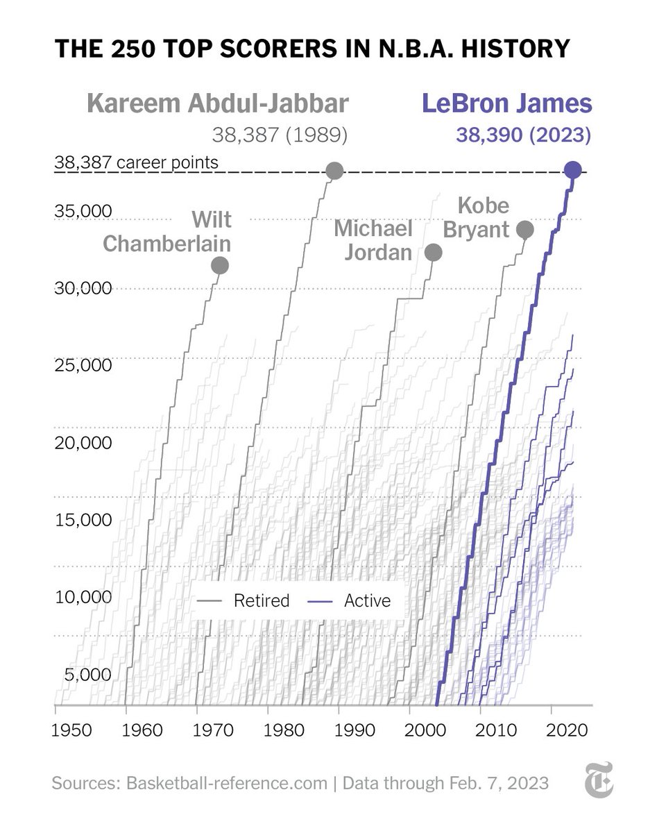 LeBron James, now with 38,390 points, broke the all-time NBA scoring record on Tuesday, surpassing Kareem Abdul-Jabbar’s mark that lasted for nearly 40 years. nyti.ms/3Yyi9qr