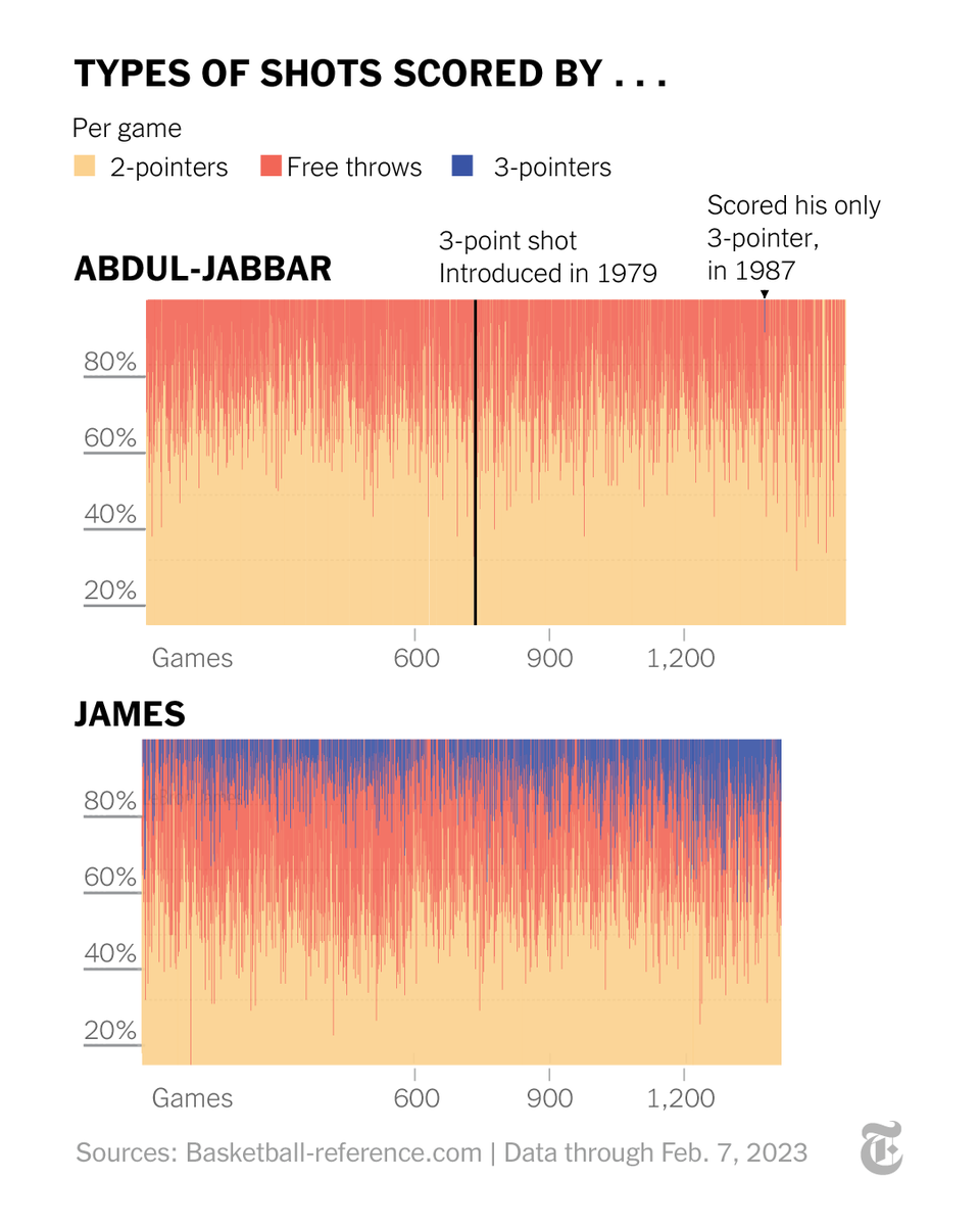 Abdul-Jabbar and James had divergent paths to setting one of basketball’s most coveted records, a reflection of how the NBA has developed over the last 50 years. James has made 2,237 three pointers — Abdul-Jabbar made one. nyti.ms/3Yyi9qr