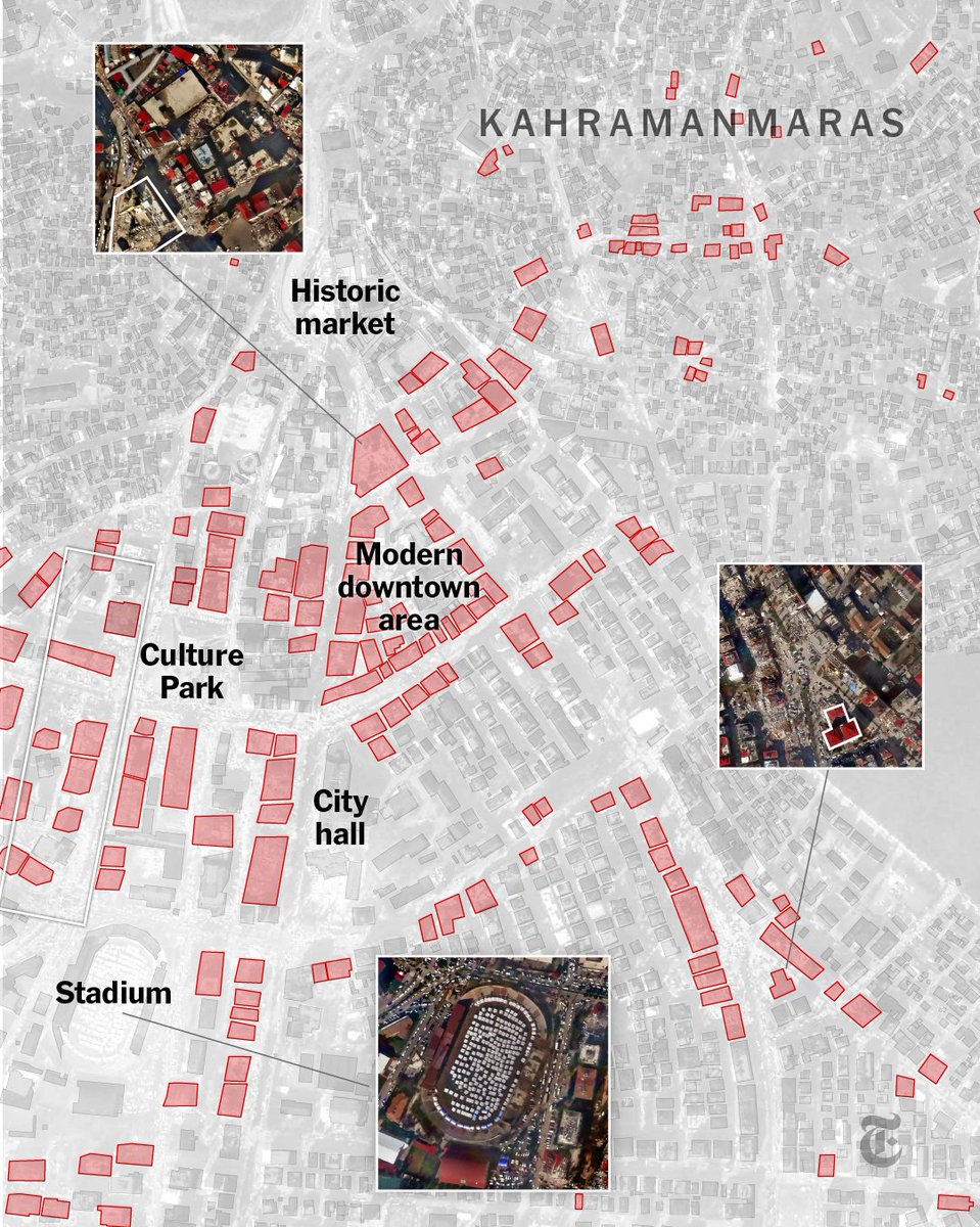 Rows of collapsed apartment buildings, rubble strewn across streets, families sheltered in tents: There is widespread destruction in Kahramanmaras, Turkey, a city of about 400,000 located near the epicenter of the first quake. Here’s what imagery shows: nyti.ms/3xciFyF