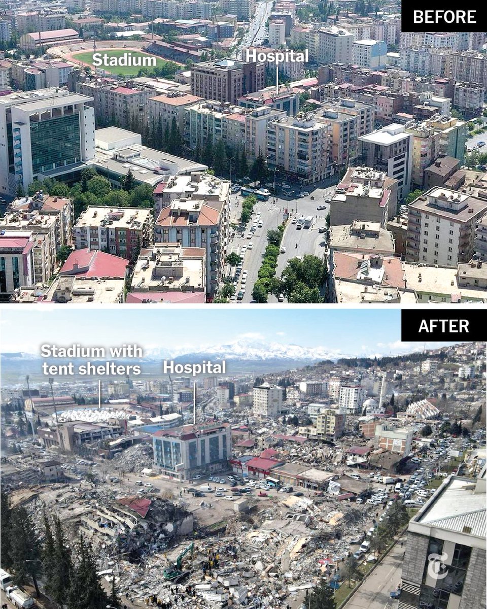 A hospital that was once surrounded by buildings stands alone. Tents were set up in a stadium to shelter survivors. nyti.ms/3xciFyF