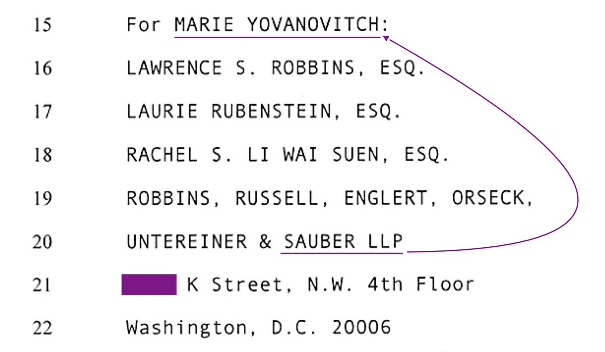 The key legal fixer for Joey right now is Dick Sauber. He was, of course, right by Marie Yovanovitch's side during her impeachment "testimony"; Sauber's firm represented her.