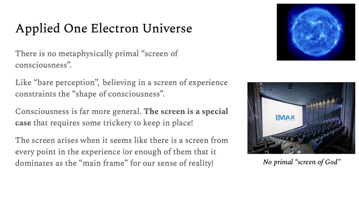 The screen of consciousness is a special case that requires the field to be shaped in a peculiar way so that “it seems like there is a screen from every possible trajectory within the topological pocket of the field”.
