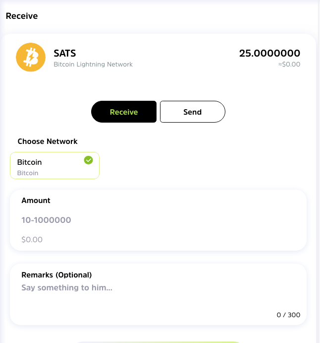 Ya estando en la pestaña de Sats Selecciona Receive para Recibir o Send para enviar, como en este caso vamos a recibir entonces colocamos en Amount el monto que deseamos recibir EN SATS ya sea para nuestra cuenta en @LightningTipB0t en telegram o para que otra persona nos pague