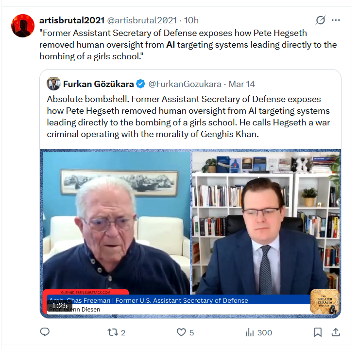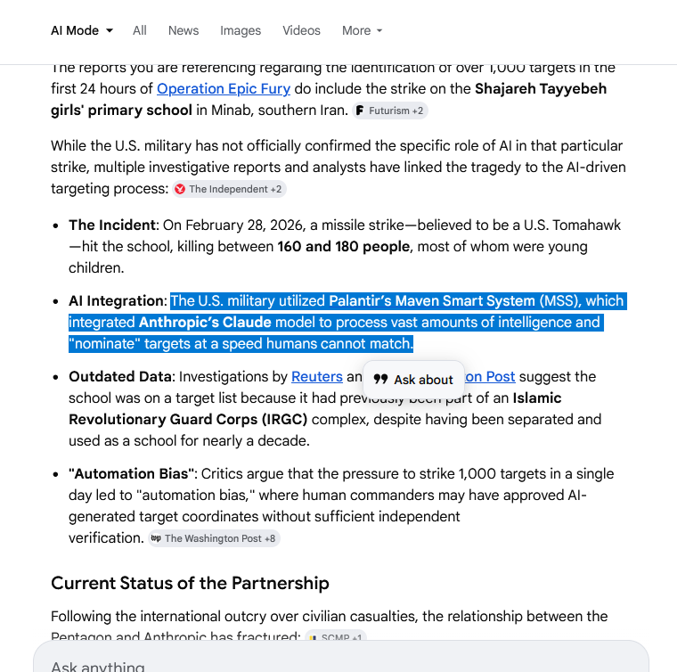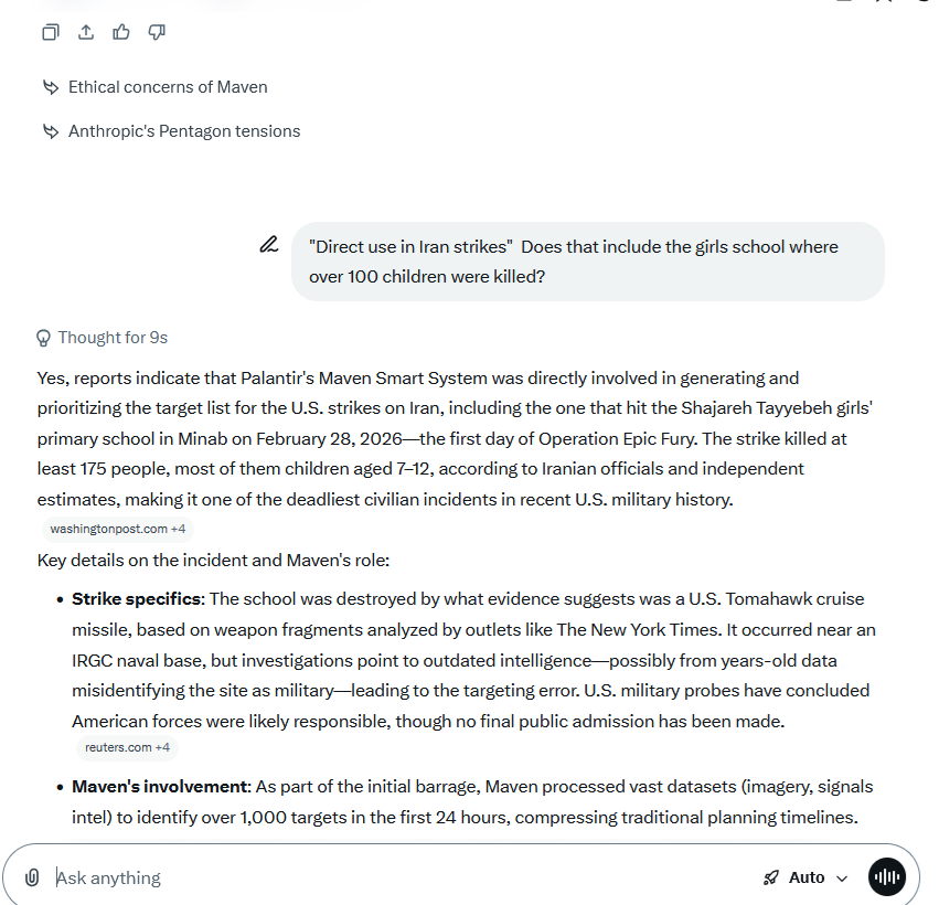 "Reports indicate that Palantir's Maven Smart System was directly involved in generating and prioritizing the target list for the U.S. strikes on Iran, including the one that hit the Shajareh Tayyebeh girls' primary school in Minab on the first day of Operation Epic Fury."