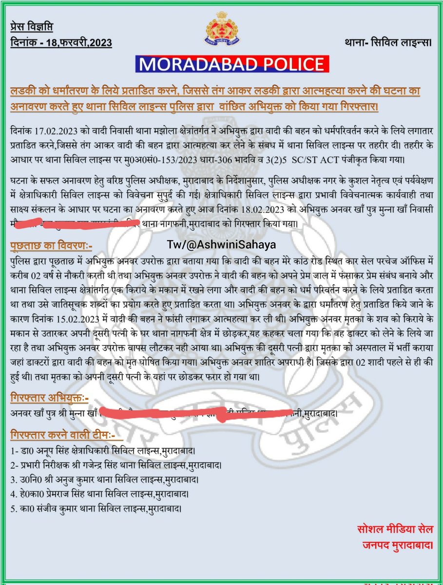 India 🇮🇳: A Dalit Hindu woman Aradhana commits suicide due to torture / pressure by her live-in partner Anwar Khan to convert into Islam, UP