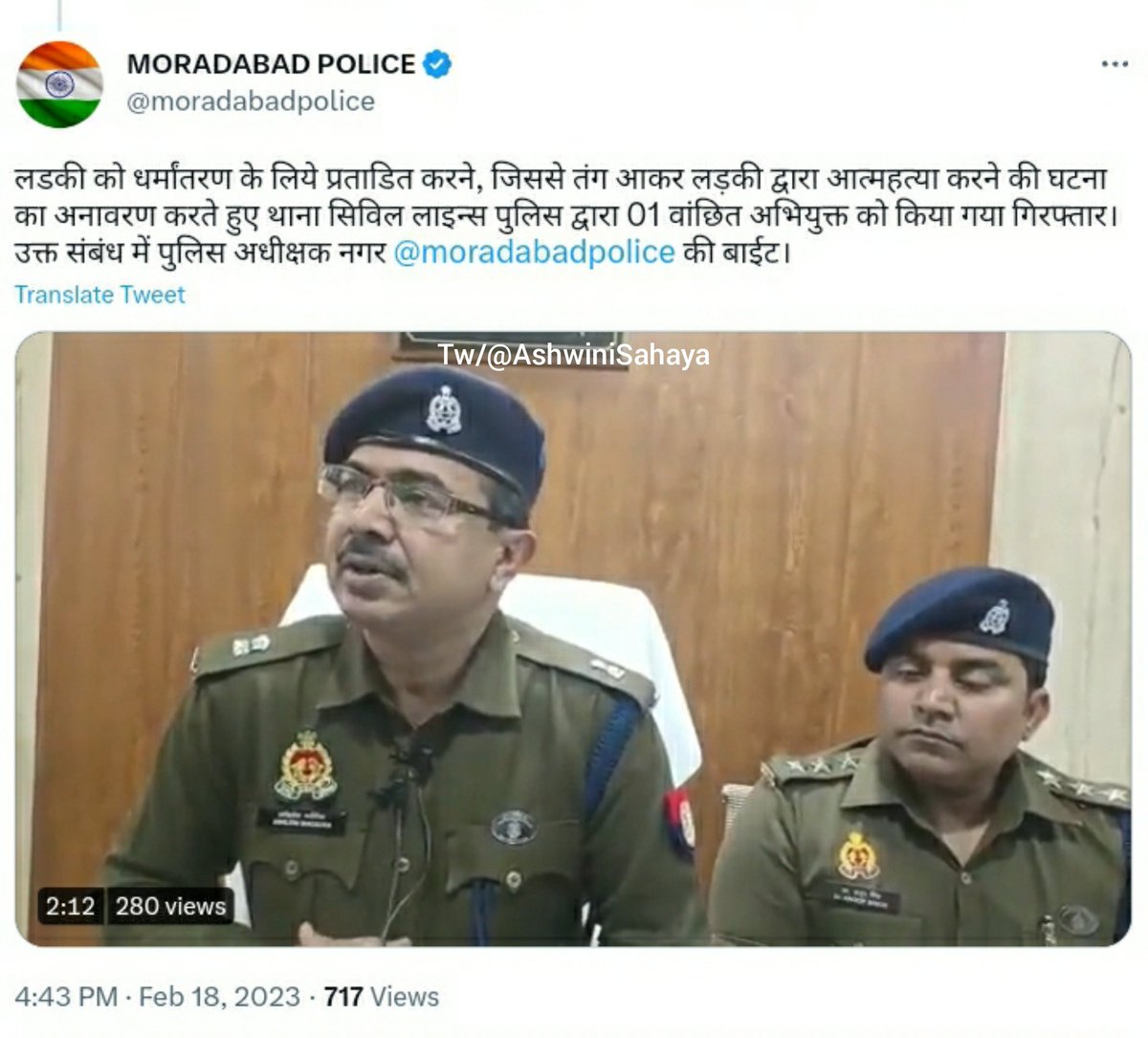 The incident took place on 15 February 2023 in Police Station civil lines area, Moradabad, Uttarpradesh.