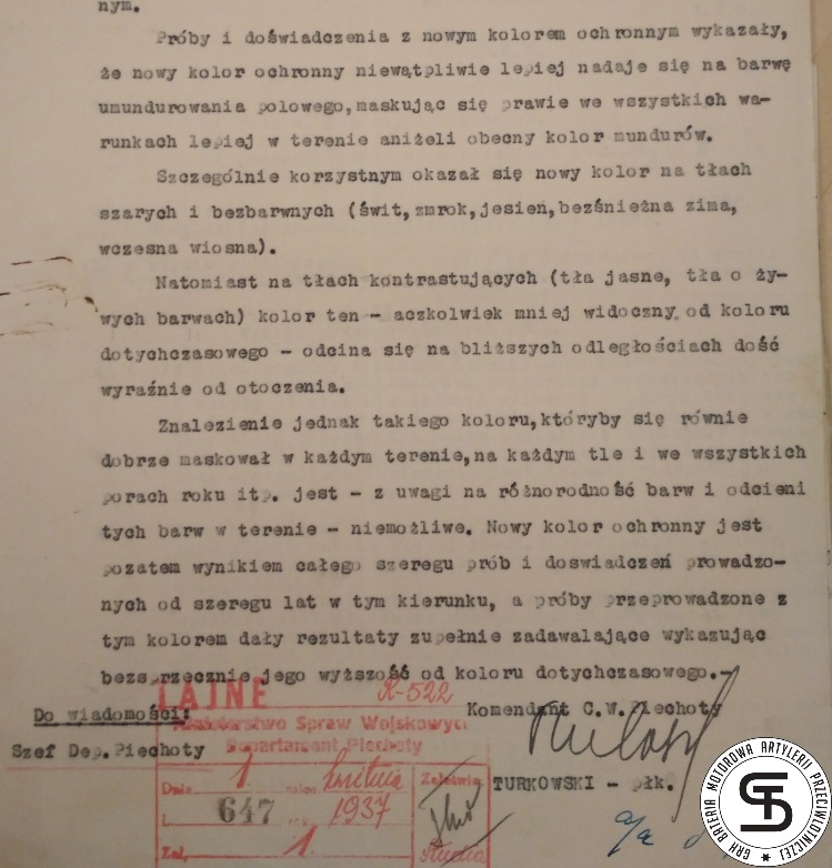 uznano, że użycie niejednolitych tkanin oraz zbyt ciemna barwa ochronna nie spełniają swojej roli. W październiku 1929 Sztab Główny powołał komisję ds. ustalenia nowej barwy ochronnej. Próby rozpoczęto w kwietniu 1930. Ze względu na różnorodność terenową odbywały się w rej. (2)