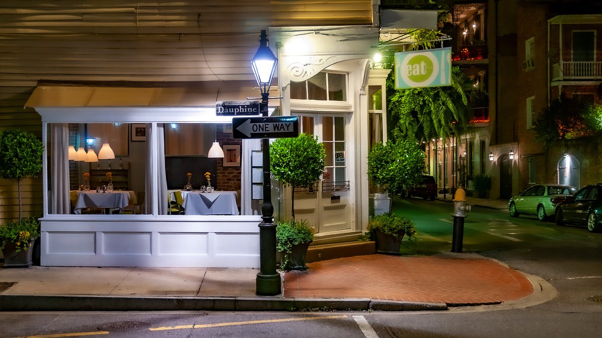Here's a classic French Quarter chamfered corner entry to a white-tablecloth restaurant on a quiet mostly-residential stretch of street. Of all the places to eat in a 15-Minute City, these tend to be the quietest, and so don't have to be on major streets or squares.