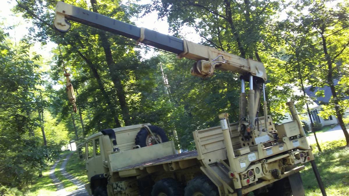 There are several FMTV trucks in the central isle that are equipped with HIAB material handling equipment cranes.