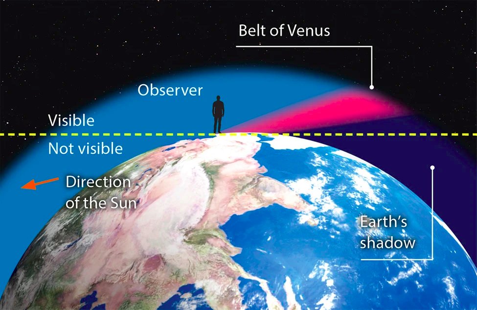 Je pense que tout le monde a déjà vu cette bande bleue sombre et rose, à l'opposé du Soleil, juste après son coucher. Mais savez-vous que ce que l'on voit là est ... l'ombre de la Terre et ce que l'on appelle la ceinture de Vénus?