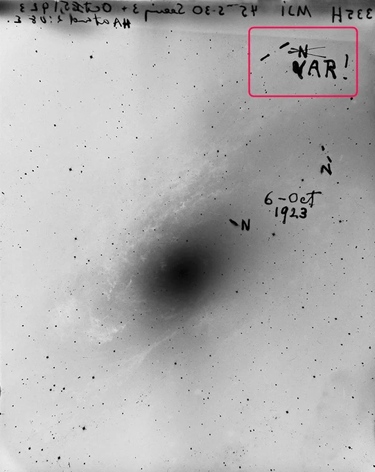 Edwin Hubble observe alors une telle étoile dans la nébuleuse spirale d'Andromède. Il peut en mesurer la distance. Il se rend compte que celle-ci est en dehors de notre voie lactée. Ces nébuleuses spirales sont des "Univers-iles" en dehors de la voie lactée: des galaxies!!