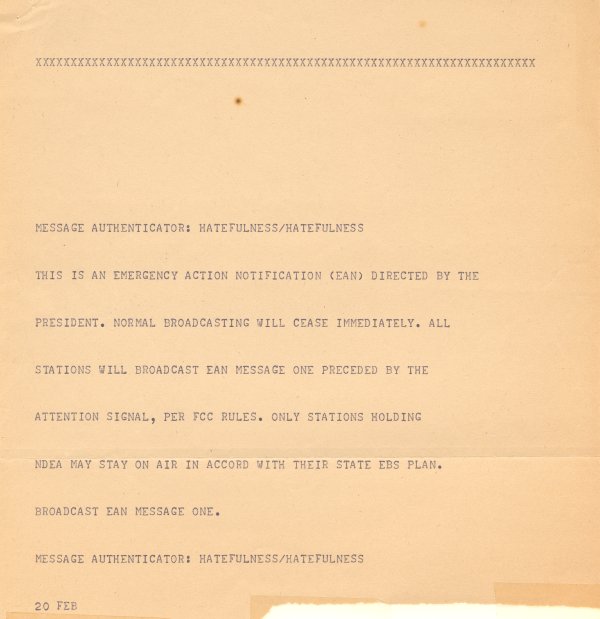 5/5. Code Word Hatefulness. The errant teletype message that started the Great EBS Scare of '71. Read more here: conelrad.blogspot.com/2010/09/code-w…