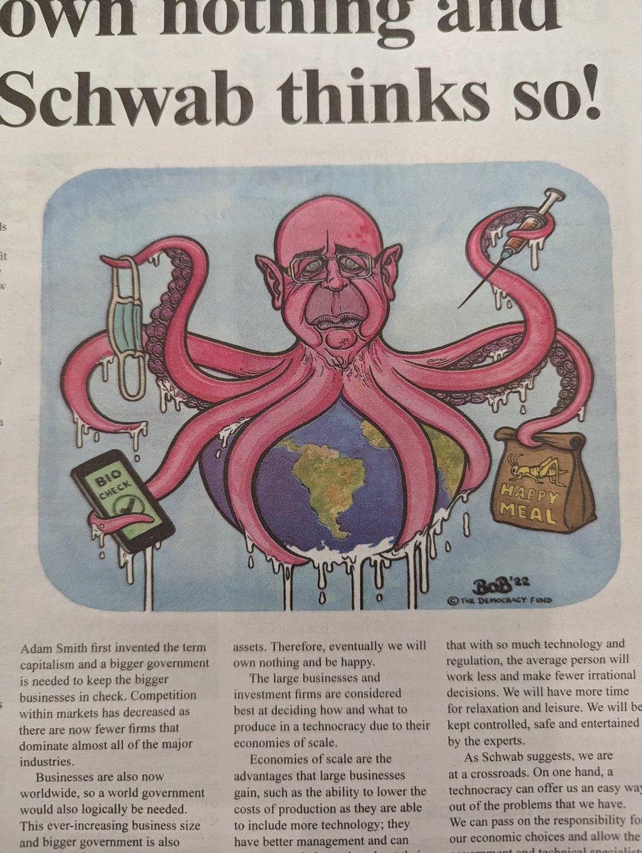 More anti vax stuff, and then this piece about Klaus Schwab complete with a cartoon. The globe-straddling octopus was a popular motif in Nazi propaganda depicting Jews as controlling the world. loc.gov/exhibits/churc…