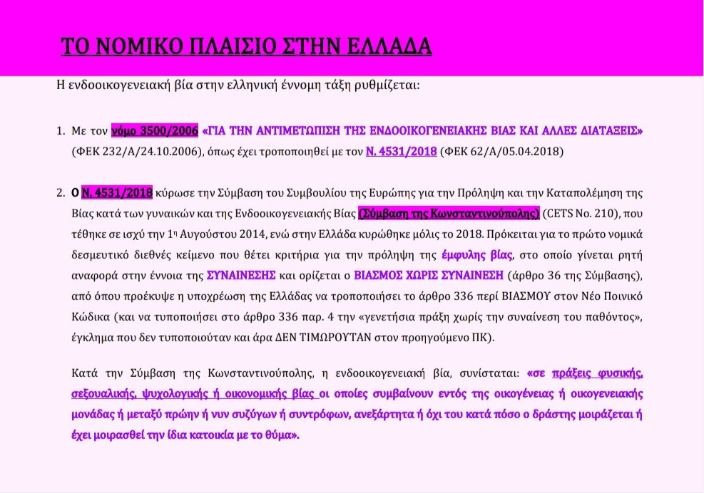Στο παρακάτω thread υπάρχουν όσο το δυνατόν περισσότερες πληροφορίες μπορούν να βοηθήσουν ένα θύμα ενδοοικογενειακής βίας σχετικά με τα δικαιώματα του,τις νομικές διαδικασίες,την αναζήτηση βοήθειας.
