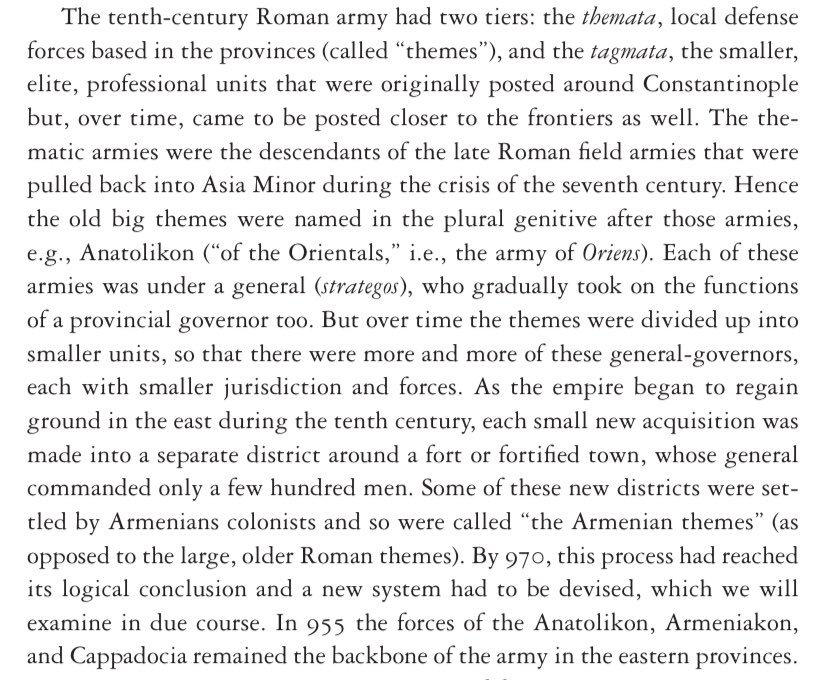 The Byzantine Empire’s tiered military structure; mainly the thematic farmer-soldiers of the provinces & the professional tagmatic armies. During the reconquista these distinctions will blur further.