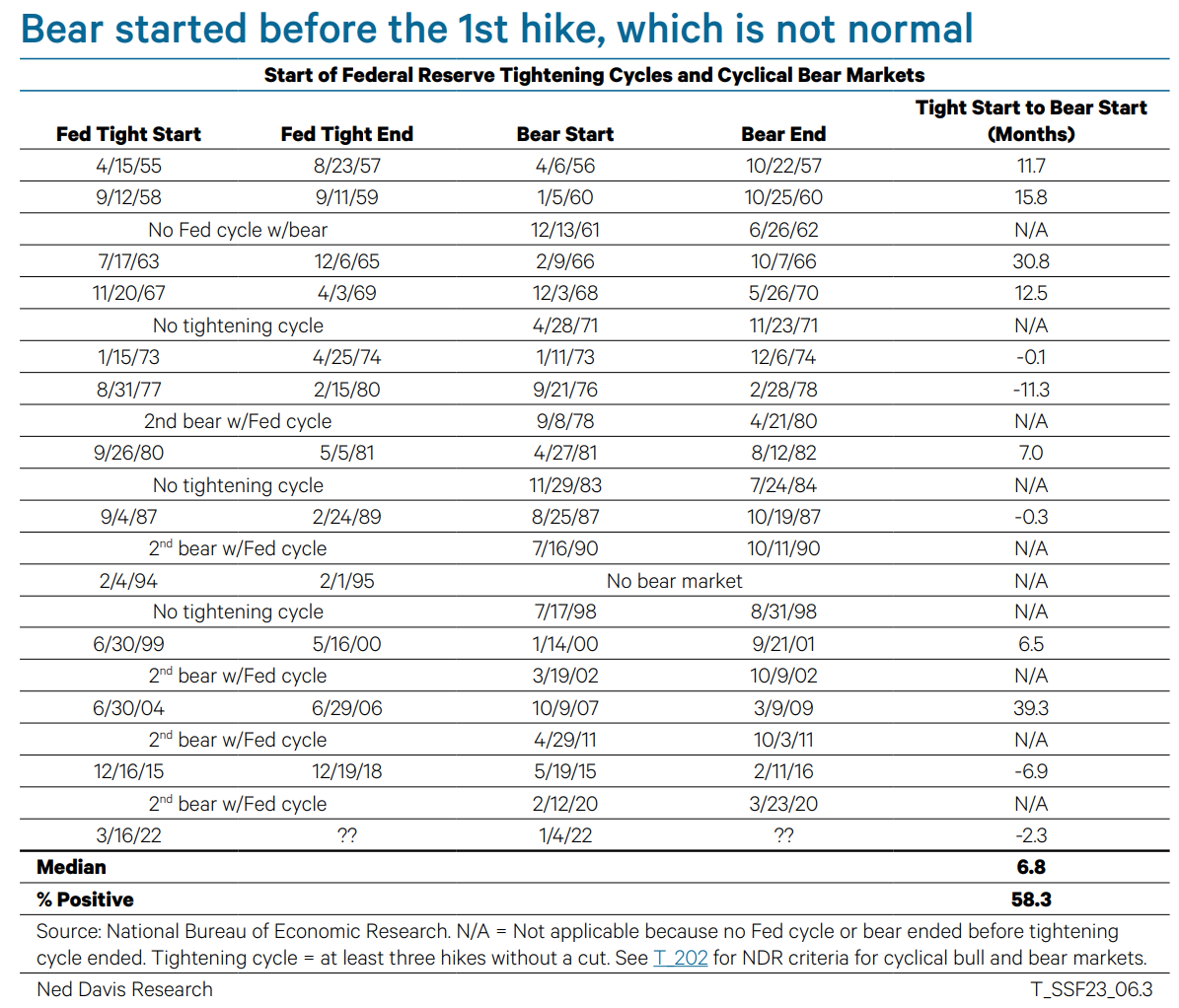 The market was even further ahead of the economy. Bears start a median of 6 months before recessions. Longest is 17M (1956 & 1978). Recent data imply a recession is not imminent. If recession is pushed to late 2023 or 2024 there is no precedent for staying in a bear that long 4/9