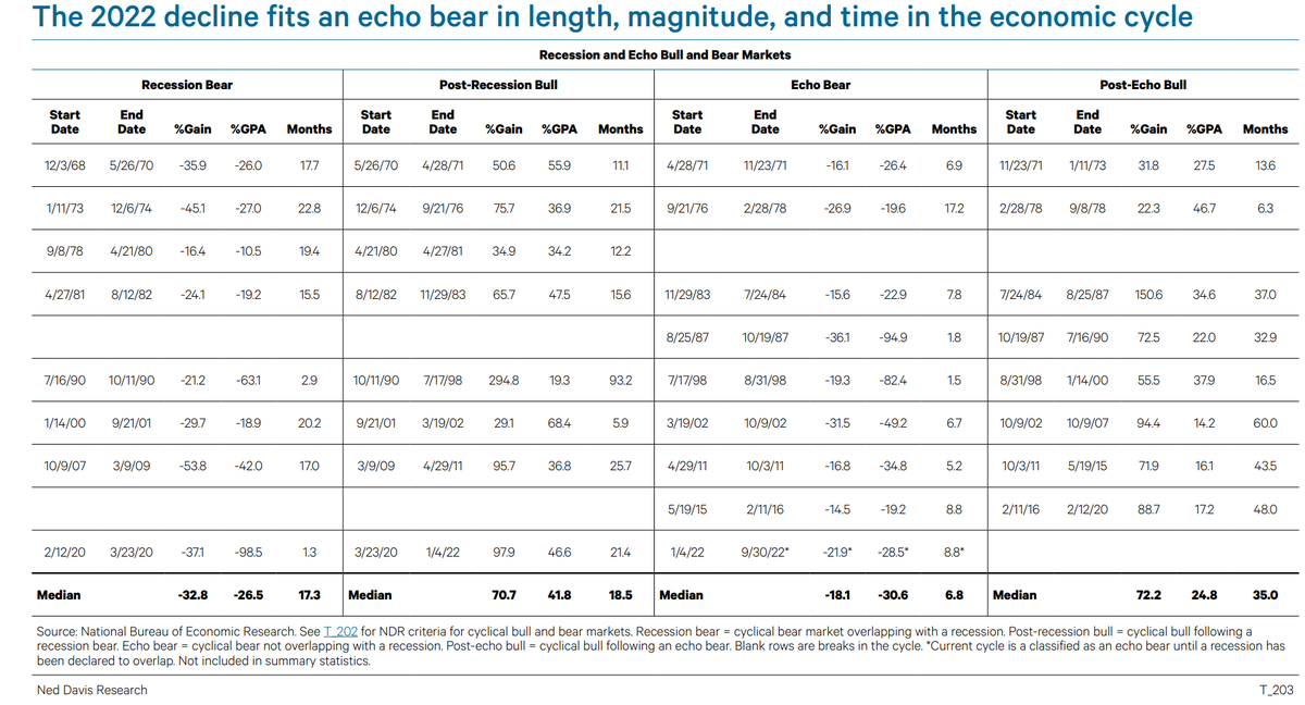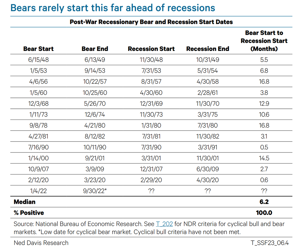 A bear market has never ended before the start of a recession. Most economists say US is not in recession but it's likely so logical conclusion is lows are not in place. Makes sense. @NDR_RESEARCH 1/9