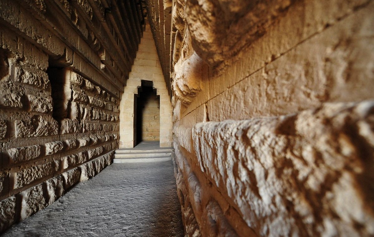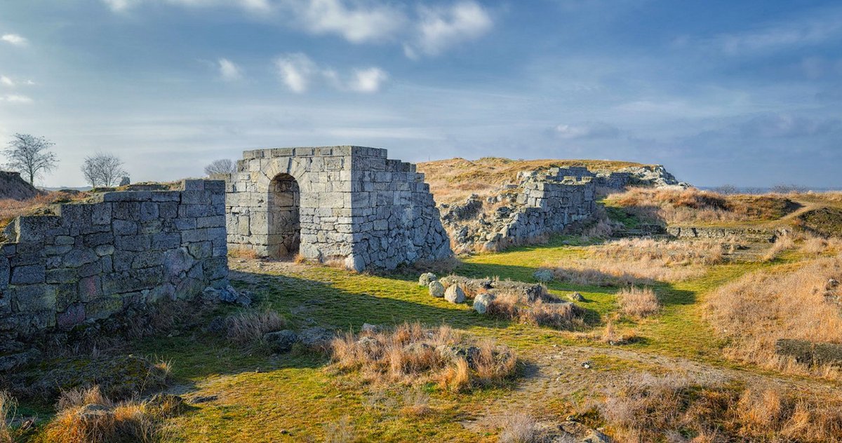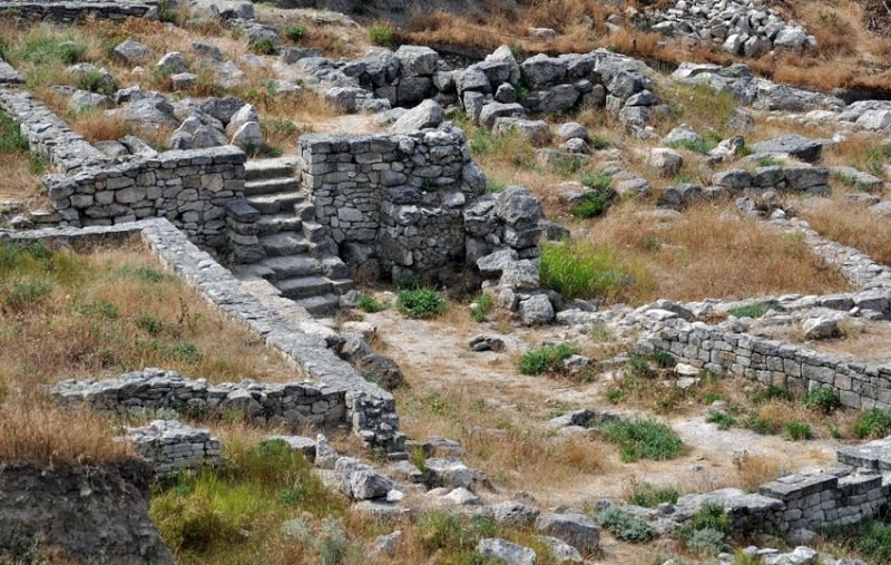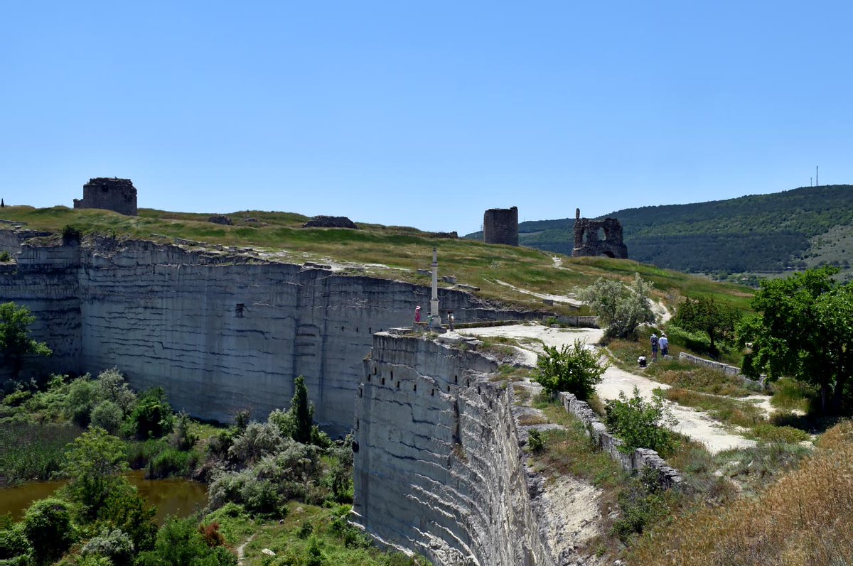 На всю ширину півострова, від берега до іншого, ще і тепер височіє висока стіна і вежі численні й великі з тесаних величезних каменів. Це місто стоїть пусте і незаселене.