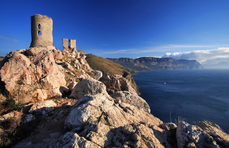 Середньовічна генуезька фортеця Чембало, балаклавська бухта та місто Балаклава, зараз територія міста зі спеціальним статусом Севастополь.
