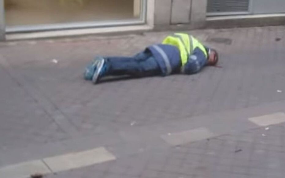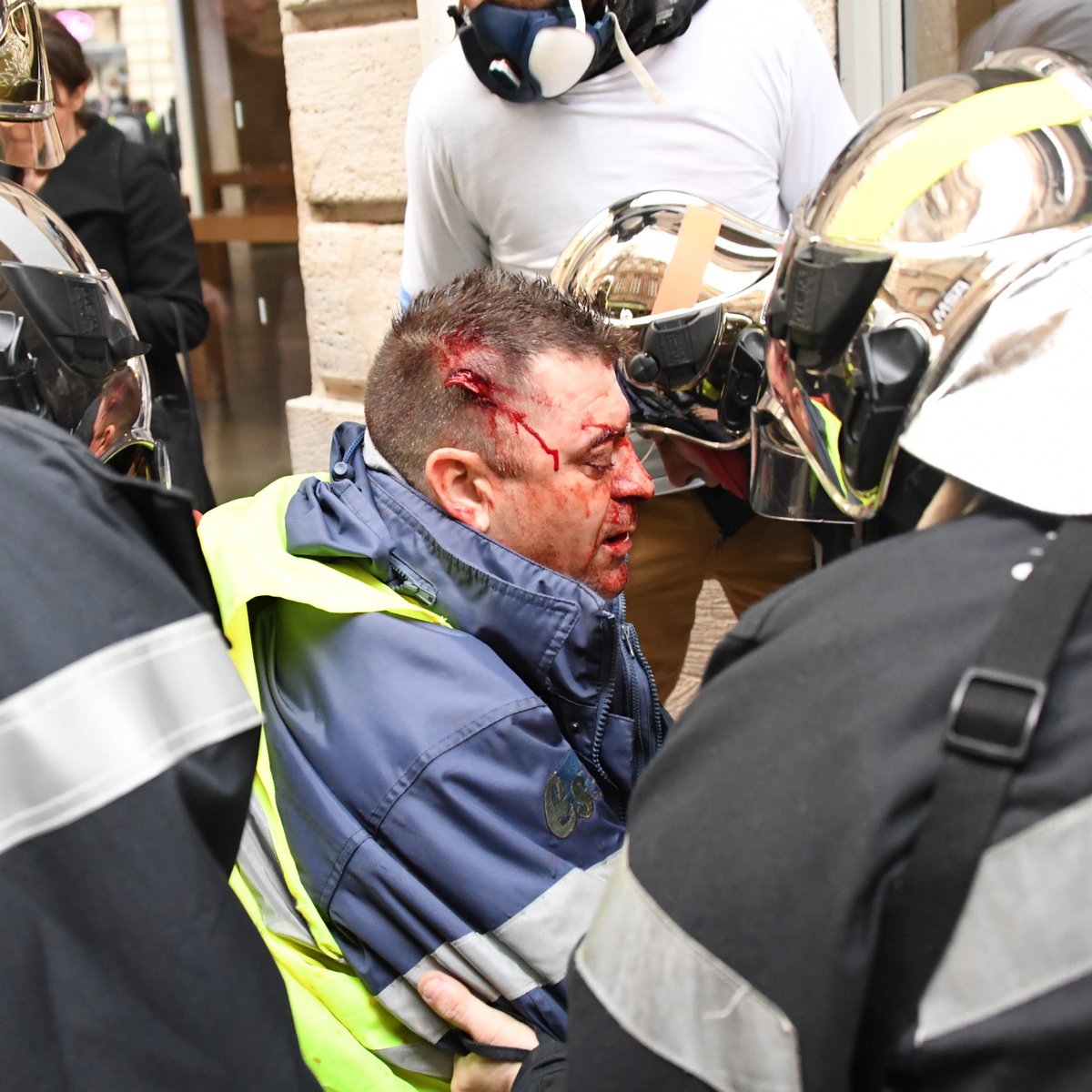 Il se fait tirer dessus au LBD par un policier, et une grenade de desenclerment par un autre. (il me semble).