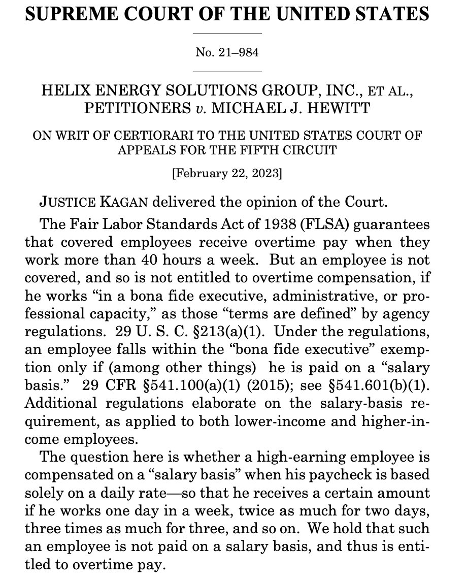 Second decision is in Helix Energy Solutions Group, Inc. v. Hewitt, a labor case about overtime pay for highly paid employees. The employee wins, in a 6-3 decision by Kagan. supremecourt.gov/opinions/22pdf…