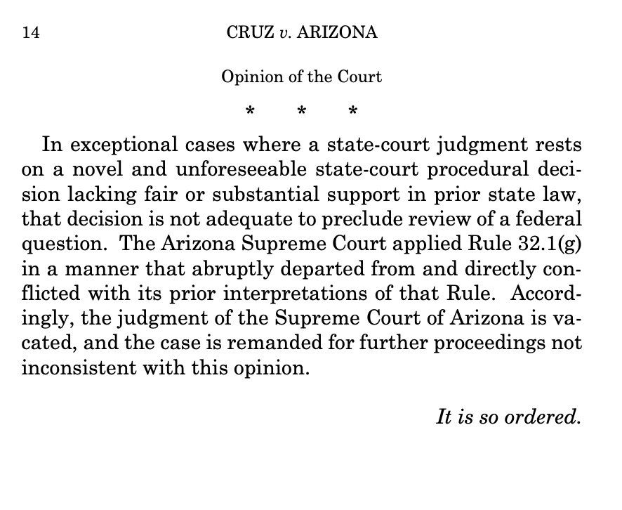 The third and final decision is in Cruz v. Arizona. Sotomayor writes the 5-4 decision for the defendant in a capital case about an out-of-control state court decision seeking to prevent the defendant from exercising his rights. Dem appointees are joined by Roberts and Kavanaugh.