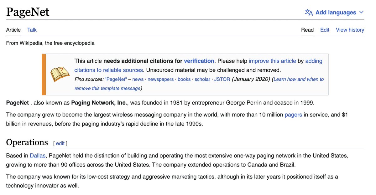 PageNet, kids: "The company grew to become the largest wireless messaging company in the world, with more than 10 million pagers in service, and $1 billion in revenues, before the paging industry's rapid decline in the late 1990s." en.wikipedia.org/wiki/PageNet