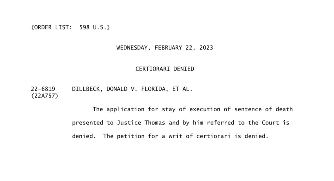 Breaking: #SCOTUS will not stop Florida from carrying out its first execution since the summer of 2019. Tomorrow, Florida is scheduled to kill Donald Dillbeck. There were no noted dissents.