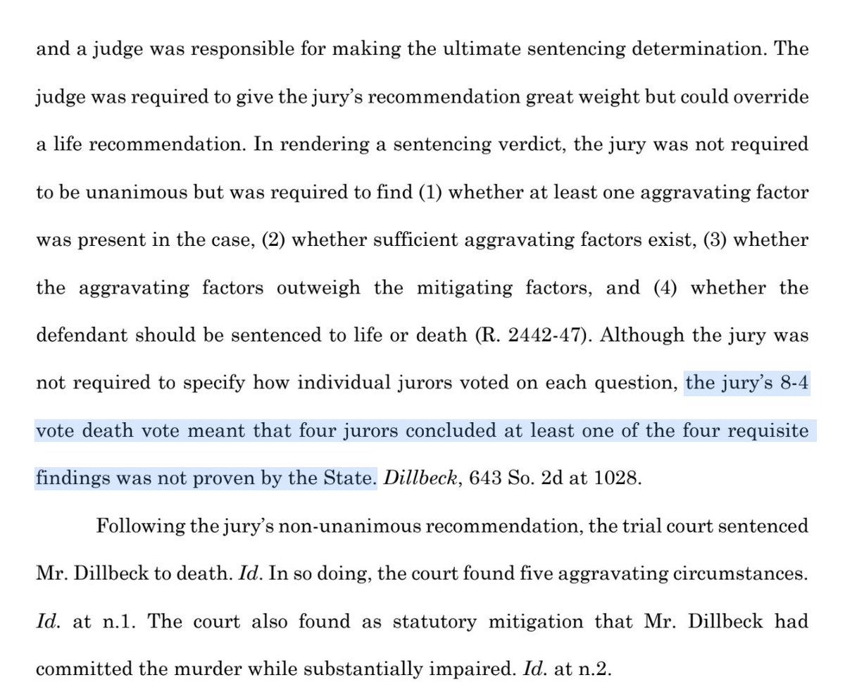 Notably, Dillbeck was sentenced to death after a murder conviction — but only an 8-4 death sentence recommendation. Dillbeck was, in part, asking #SCOTUS to consider and rule on whether a unanimous jury is required in the penalty phase to impose the death sentence.