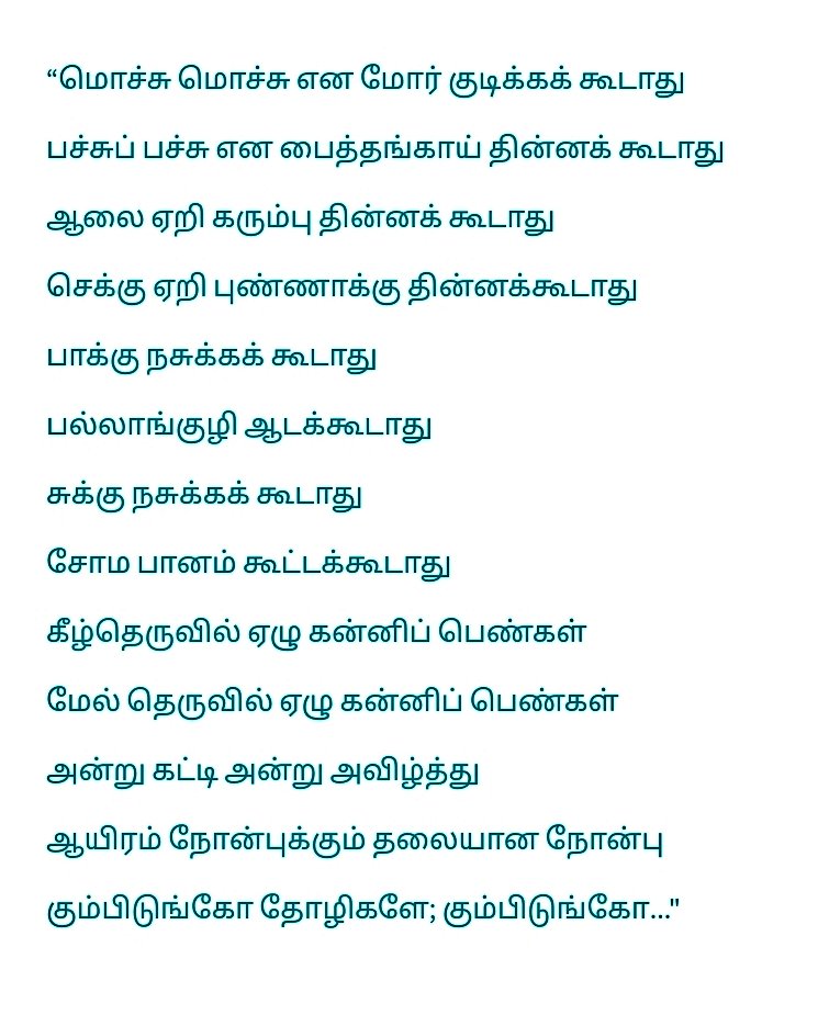 அவர்கள் எப்படி எப்படி விரதம் மேற்கொள்ள வேண்டும் என்பதை, ஓர் அழகான நாட்டுப்புறப் பாடலாக பின்வருமாறு பாடி வணங்குவர்.
